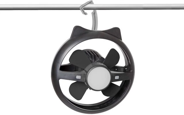 Das funktionelle Design ermöglicht die Befestigung des Ventilators an Zeltdecken oder Wänden mittels Klappgriff und/oder Haken.