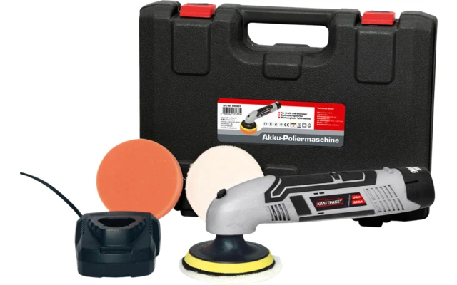 Der Lieferumfang besteht aus je einmal: Poliermaschine, Akku, Schnelladegerät, Polierteller 100 mm, Polierschwamm 100 mm, Polierfell 100 mm, Polierpad 100 mm, Koffer für Maschine und Zubehör und deutscher Gebrauchsanweisung.