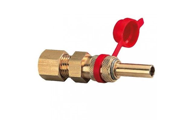 Mit Zusatzsicherung. Auf der einen Seite mit Überwurfmutter und Schneidring (für 8 mm Rohre), auf der anderen Seite 8 mm RST (für Schläuche mit Schneidringverschraubung) und Schutzkappe.