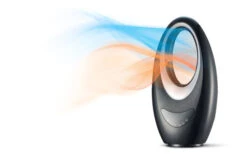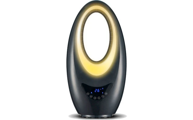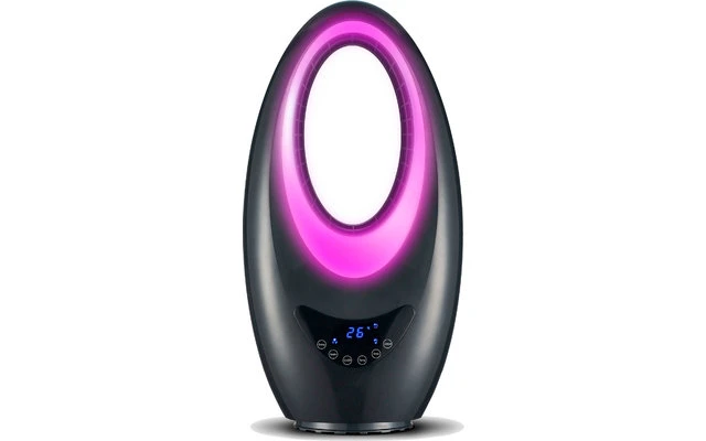 Rotorloses Design-Heizgerät mit vier verschiedenen Stimmungslichtern (hellblau, grün, dunkelblau, lila) und zuschaltbarer Oszillation.